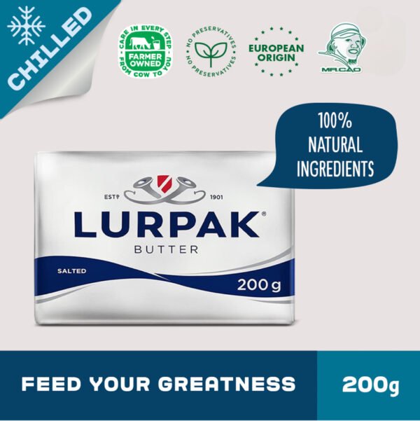 Bơ mặn khối Lurpak gói 200g được phân phối bởi MrCao Mart là sự hòa quyện hoàn hảo của chất béo độc đáo và hương vị mặn ngon đặc trưng của Lurpak.