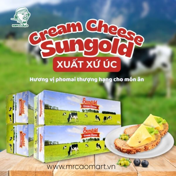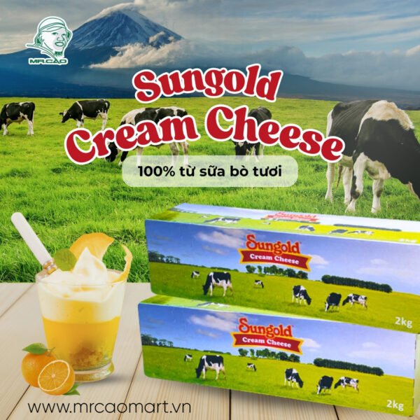Cream cheese Sungold có bán tại các cửa hàng Đại Lý chi nhánh Mr Cao Mart tại Sài Gòn,Hà Nội,Đà Nẵng,Cambodia và Lào là dạng phô mai tươi, màu trắng, mềm, có vị chua nhẹ nhàng và có độ béo cao nhưng ko ngán. Đây là nguyên liệu chính và rất quen thuộc để làm cheesecake – bánh phômai.