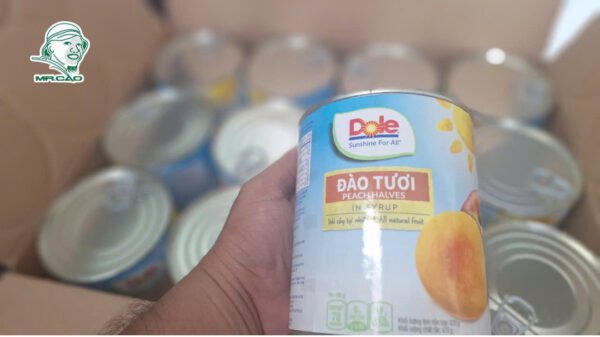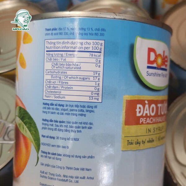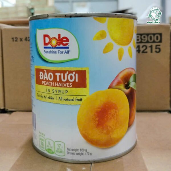 ĐÀO CẮT MIẾNG – PEACH HALVES DOLE 820G có bán tại Mr Cao Mart (www.mrcaomart.vn) là sản phẩm đào đóng hộp, được cắt thành miếng và ngâm trong siro đường ngọt nhẹ, giữ nguyên hương vị tươi ngon của đào. Sản phẩm này có thể dùng ăn trực tiếp hoặc làm nguyên liệu cho nhiều món tráng miệng và đồ uống khác như trà đào, salad, bánh ngọt.