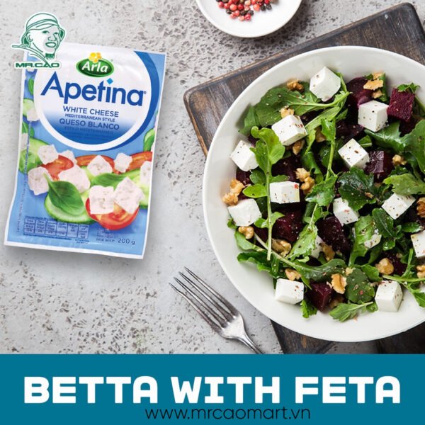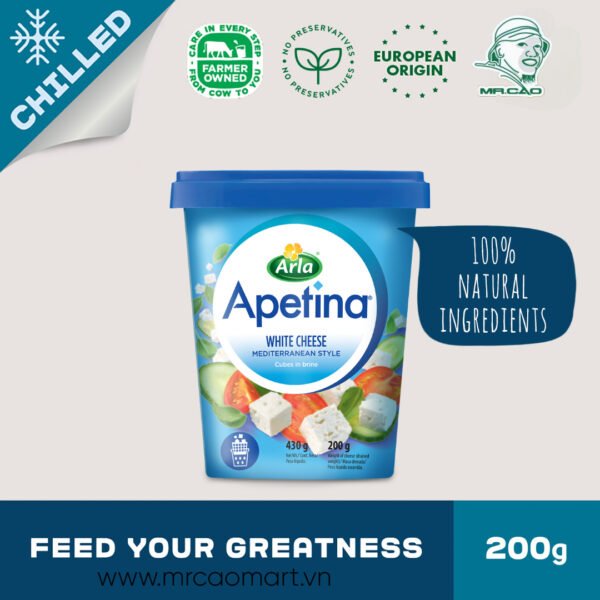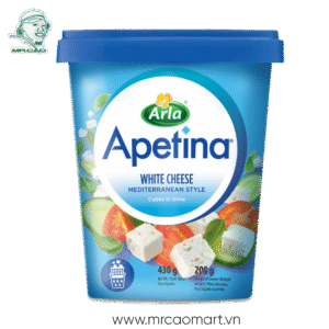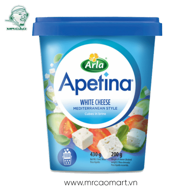 Phô Mai Apetina Ngâm Muối – Apetina Feta Cheese được phân phối bởi MrCao mart là một loại phô mai trắng mềm, vị mặn nhẹ, chua thanh, làm từ sữa bò tươi và được ngâm trong dung dịch nước muối để giữ trọn hương vị đặc trưng của phô mai feta Hy Lạp. Sản phẩm thuộc thương hiệu Arla Foods, một tập đoàn sữa lớn của Đan Mạch.