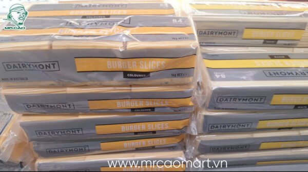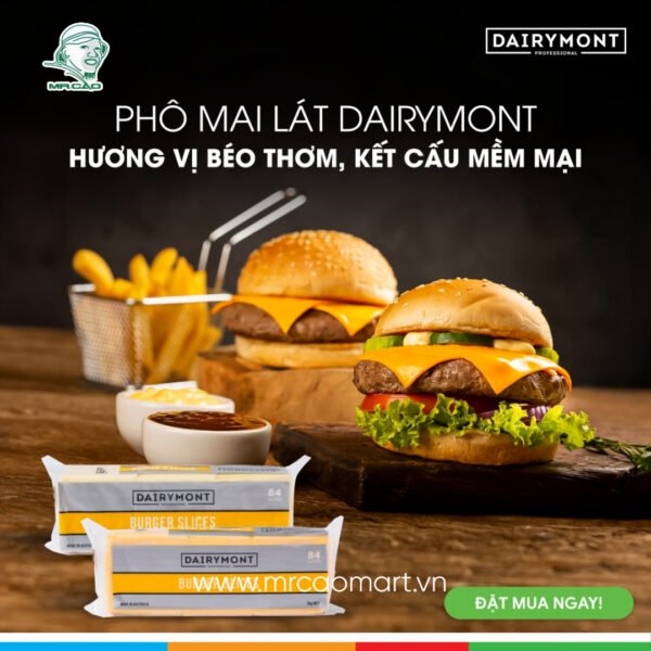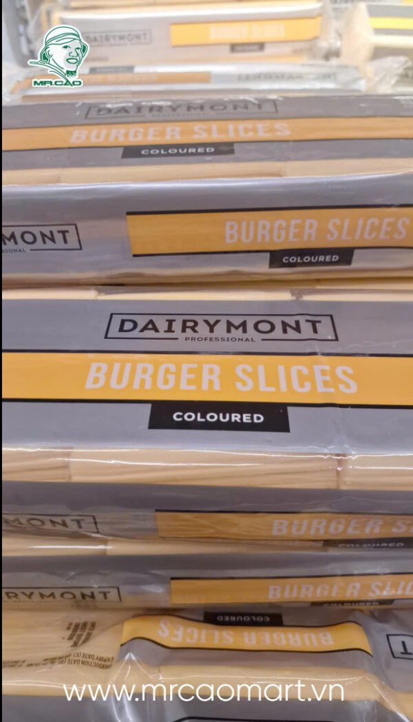 BURGER SLICES DAIRYMONT 1KG được phân phối bởi MrCao Mart là tên gọi của phô mai lát thương hiệu Dairymont, xuất xứ Úc, với khối lượng 1kg, được thiết kế để sử dụng làm lớp phủ cho bánh mì kẹp thịt (burger) và các món ăn khác, có đặc điểm là lát mỏng, màu sắc hấp dẫn và tan chảy ngon khi nấu.