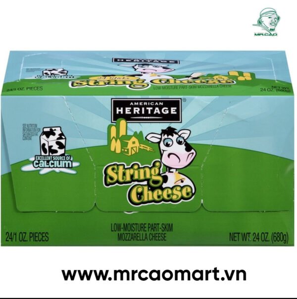 Phô mai que kéo sợi American Heritage String Cheese Mozzarella có bán tại MrCao Mart mang thương hiệu Mỹ, sản xuất trên quy trình công nghệ hiện đại, nguyên liệu an toàn tuyệt đối với người tiêu dùng.